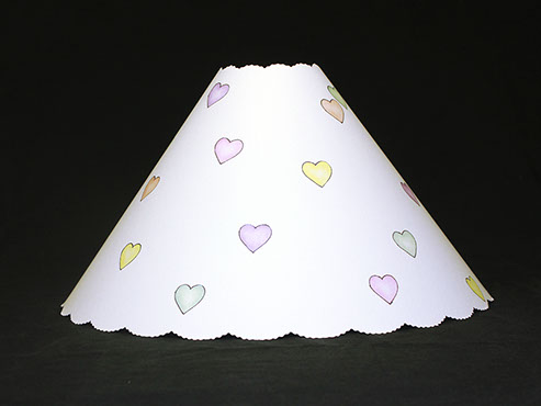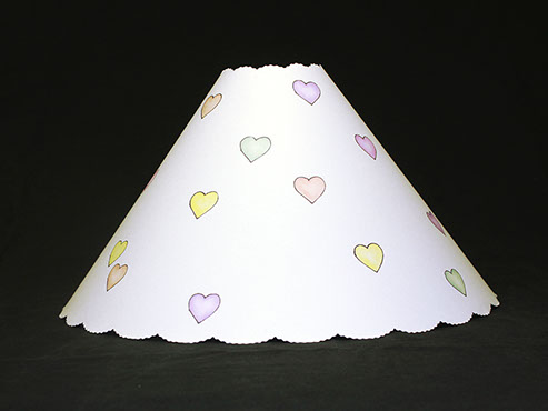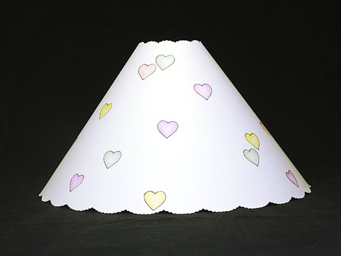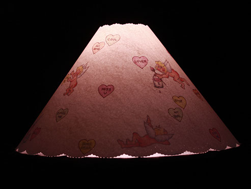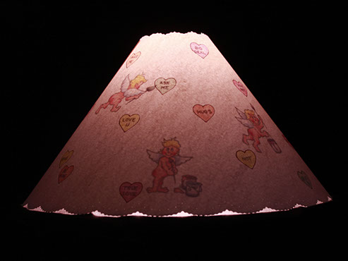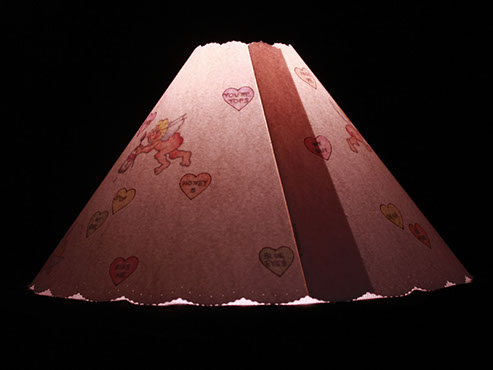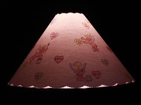 Valentines Day. Plain pastel candy hearts adorn the top of this cover. The light reveals cute little cupids painting sayings on the heart candies. #414